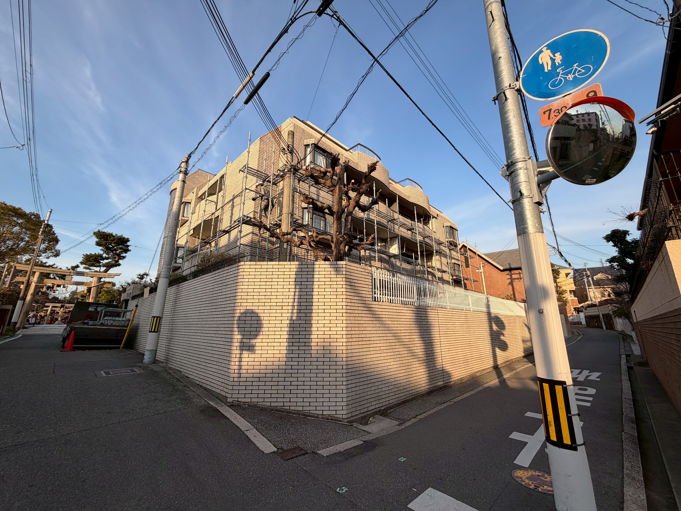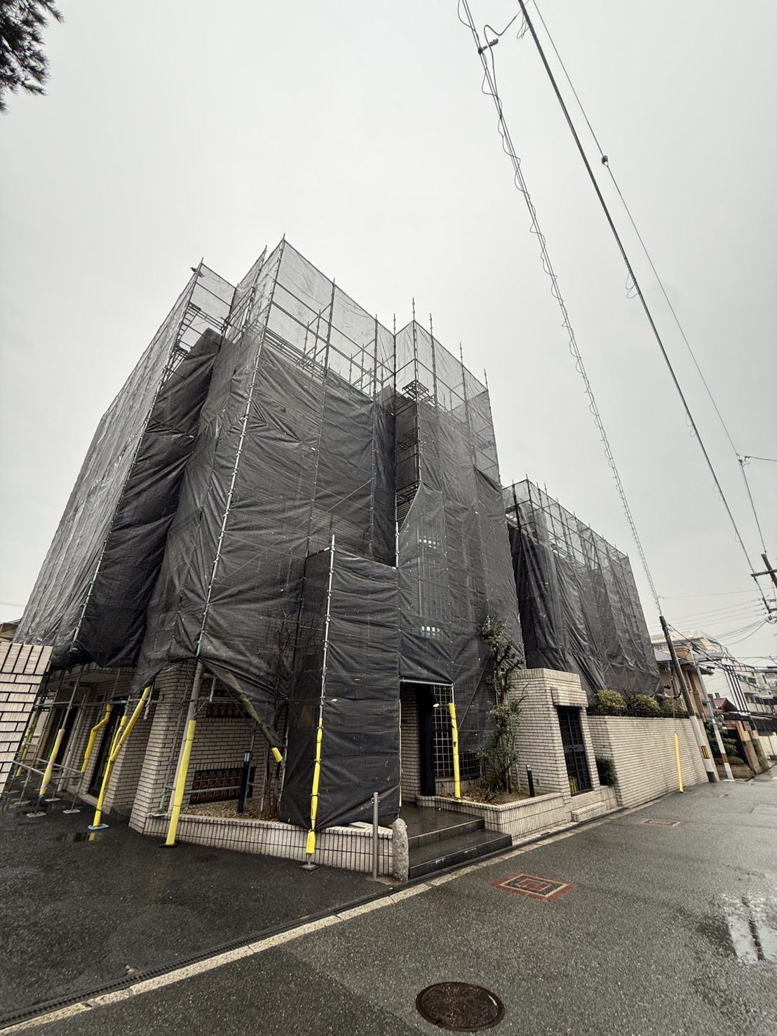 フィルウッド北畠の外部改修工事において、外部足場の組立を行いました。